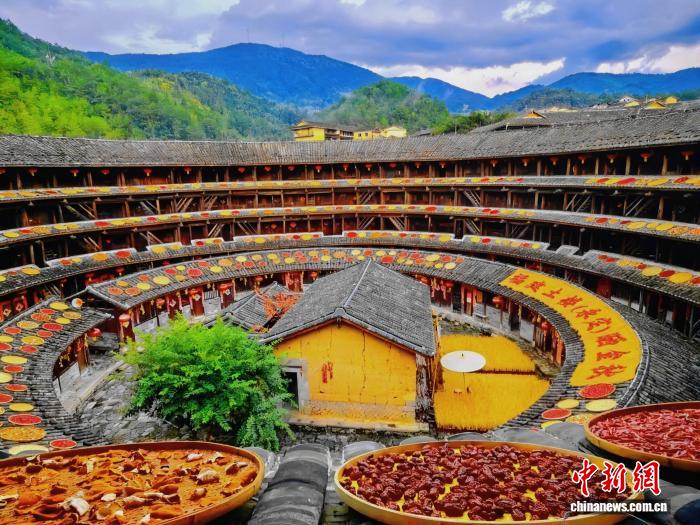 文旅中新网福建永定9月17日电 (黄秋萍)连日来,福建土楼永定初溪土楼景区迎来了“晒秋”的最佳观赏期,圆形土楼内的晒架上,金黄的稻谷、火红的辣椒、橙黄的南瓜等农作物错落有致地摆放着,与古朴的夯土建筑相映成趣,勾勒出一幅独具客家风情的秋日丰收画卷,吸引众多游客前来打卡赏景。 在永定初溪土楼群的集庆楼内,数十个木质晒架整齐排列,当地村民正忙着将刚收获的农作物晾晒在晒架上。饱满的玉米串成串、圆润的南瓜堆成小山,辣椒、红枣、陈皮等色彩艳丽的作物在阳光照耀下格外耀眼,既满足了农作物晾晒的实际需求...